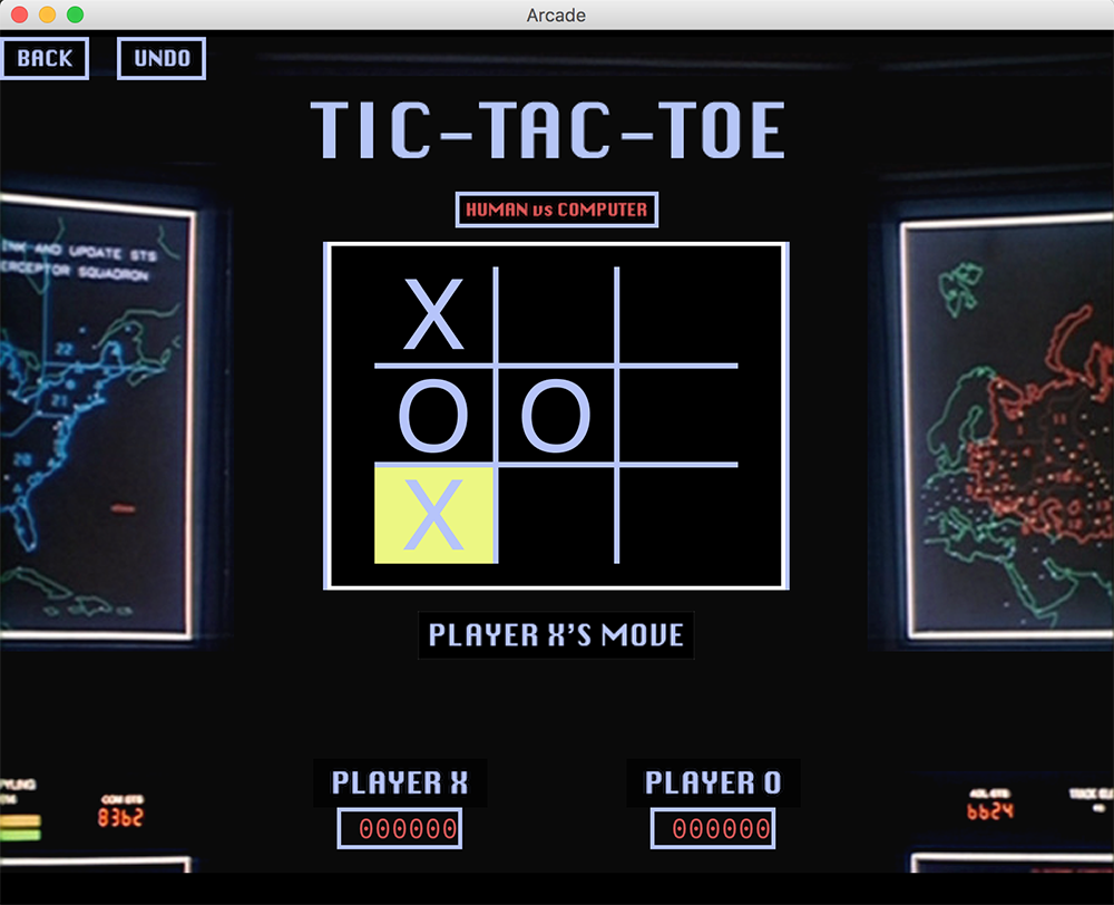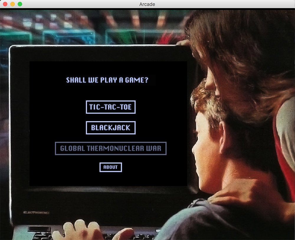 Arcade game suite including tic-tac-toe and blackjack. Visual design based upon the 1983 film WarGames. Written in Java with fellow student Cody Slarks.